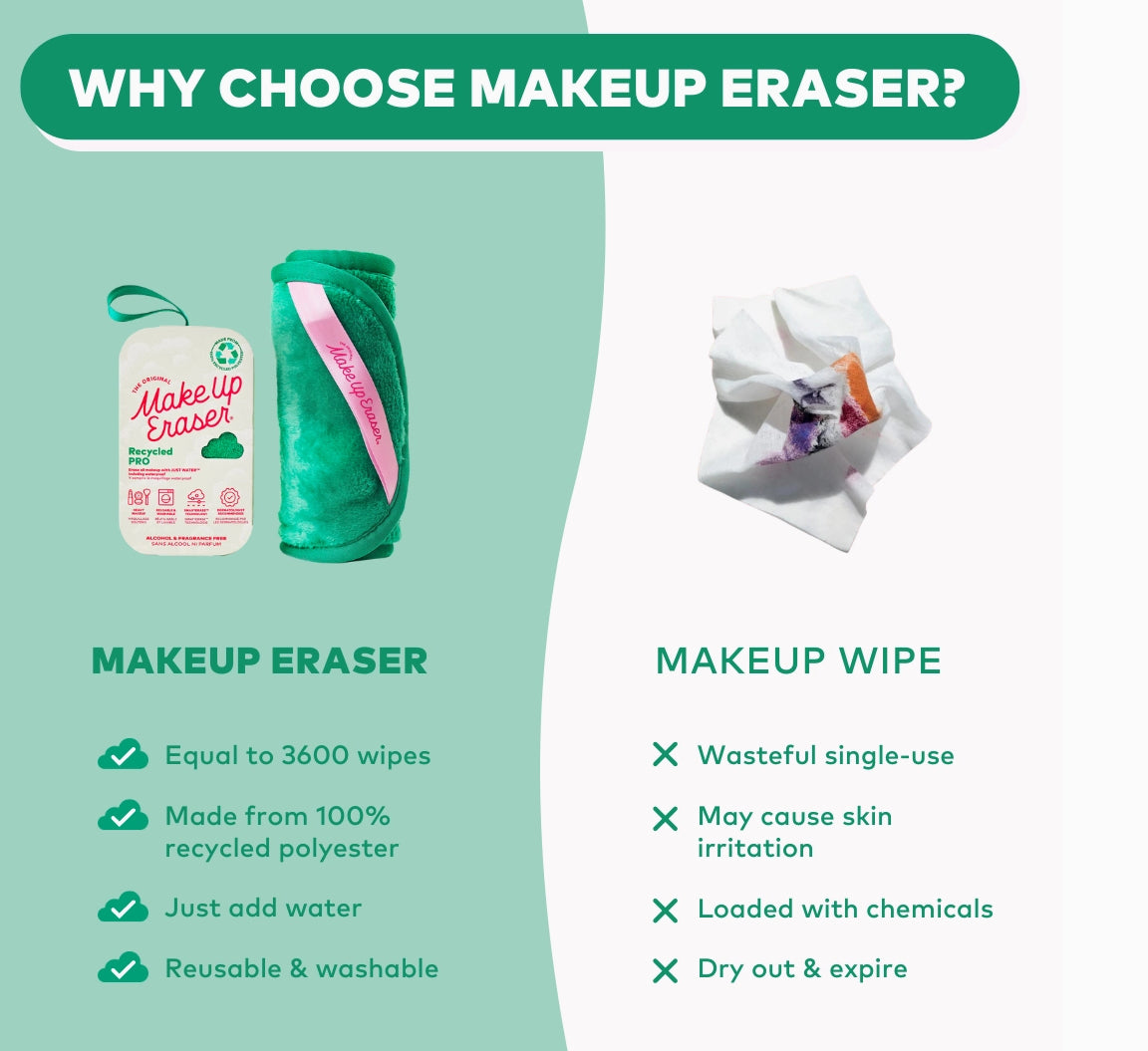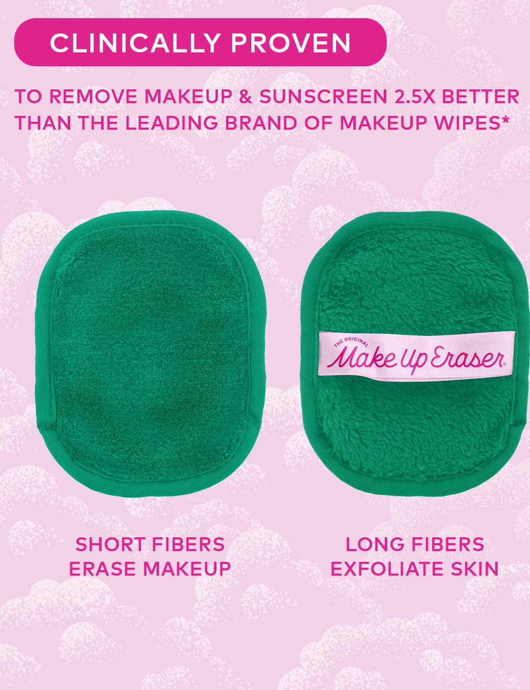 Featuring 100% Recycled Fibers, sourced from plastic bottles to reduce waste. Erase all makeup with JUST WATER™ including waterproof. Our patented, water-activated, cloud-soft fibers gently & easily remove all makeup & sunscreen from pores. 2 in 1 benefit: one side erases makeup & one side exfoliates skin. The Original MakeUp Eraser® is non-irritating and non-drying. It's non-comedogenic, safe for lash extensions, & entirely oil-free for a luxury experience. ✓ Dermatologist Recommended ✓ Reusable & machine washable (1000+) ✓ Clinically proven to remove makeup & sunscreen 2.5x better than the leading brand of makeup wipes MakeUp Eraser is powered by SmartErase™ Technology, featuring unique cross-section microfibers engineered for efficient makeup removal using electrostatic forces, & enhanced when wet. This innovation also allows for easy stain removal with machine washing.