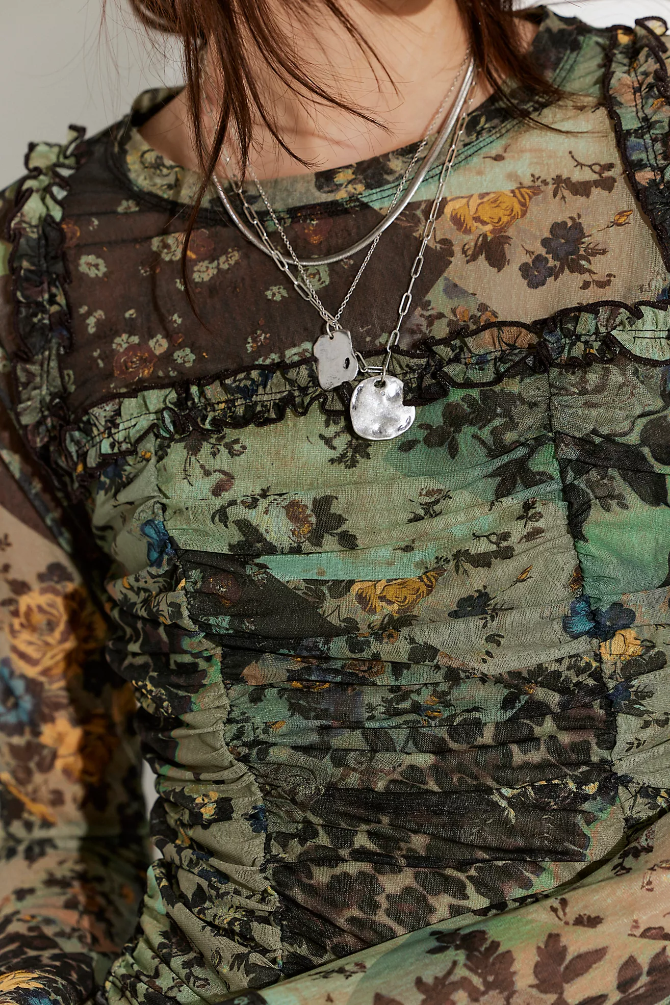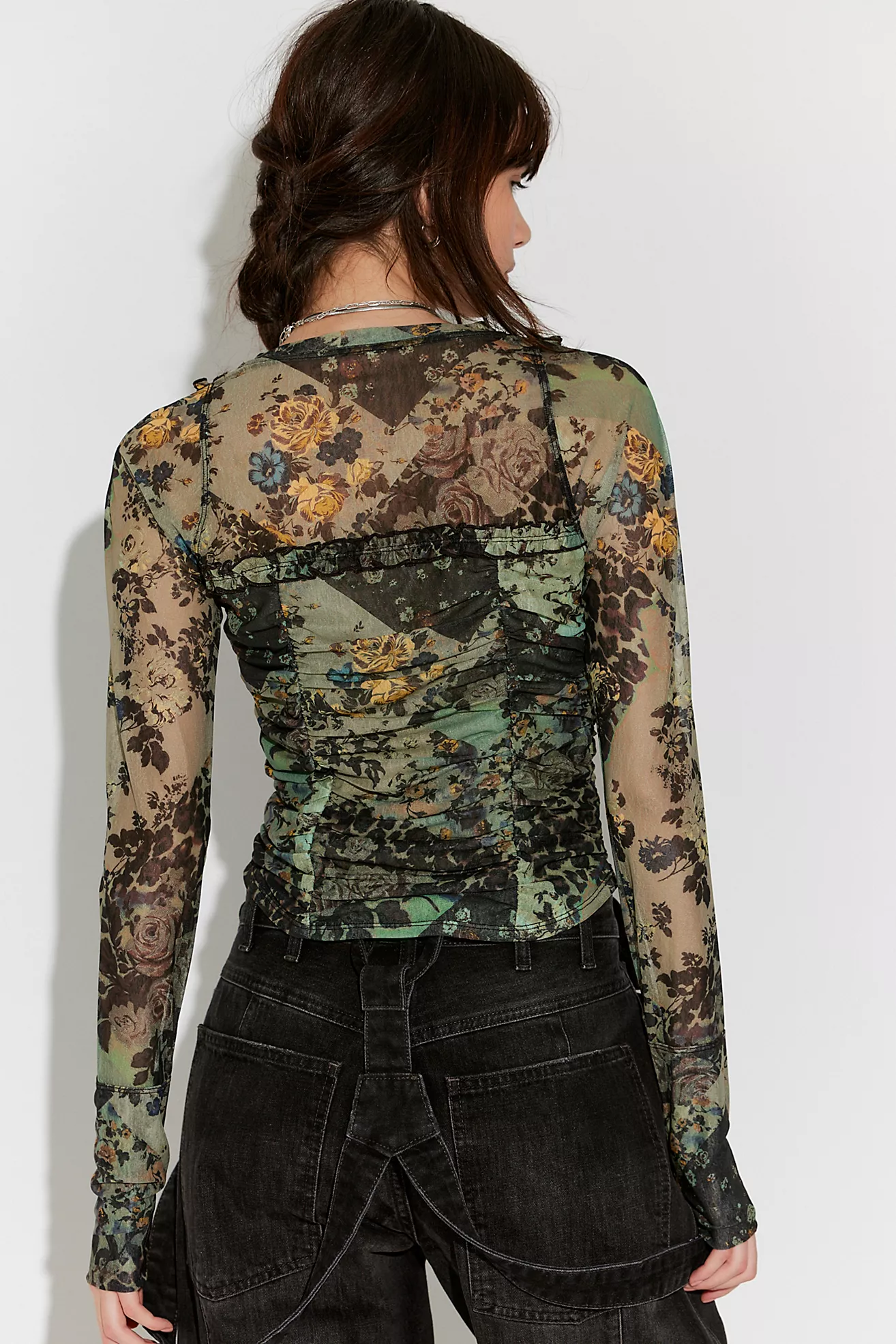 Forever flattering, this bold top features a fitted, ruched silhouette, a semi-sheer mesh fabrication, and ruffled details for a femme finish.