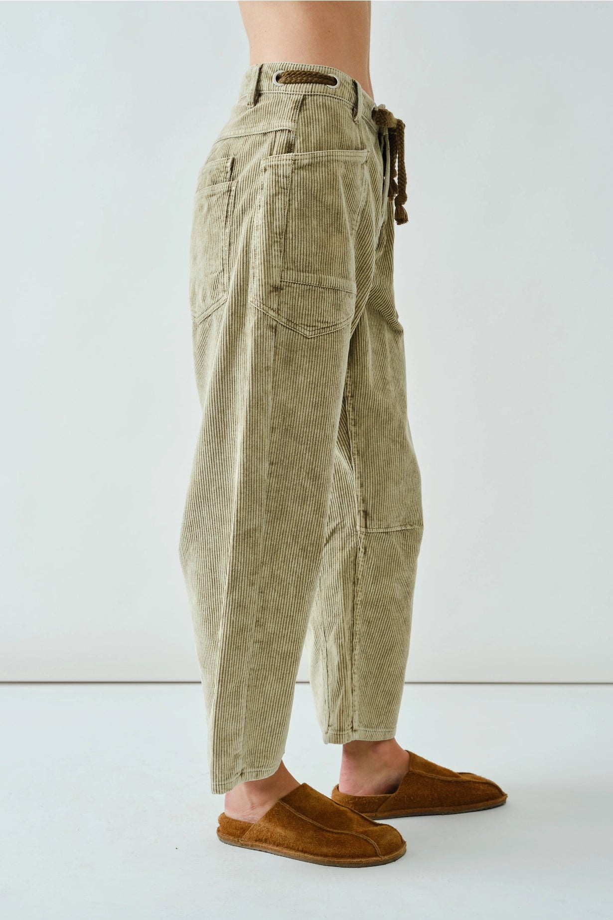 These pants feature a soft corduroy fabric. Designed with a relaxed, cropped barrel-leg silhouette. The eyelet waist detail with a braided tie adds both comfort and a touch of bohemian charm. Finished with roomy front patch pockets. -barrel-leg fit -Cropped length -Eyelet waist with braided tie closure -Front patch pockets