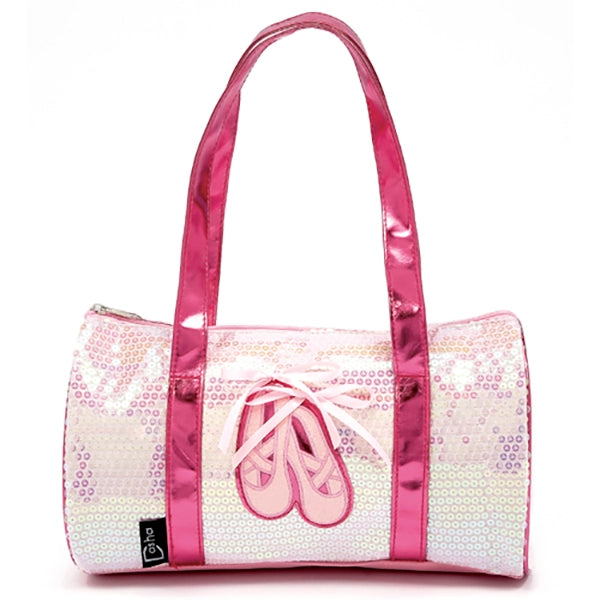 Girls love this delicate opalescent sequin bag trimmed with a flash of shiny fuchsia. Measures approximately 12" x 7" x 5.5"