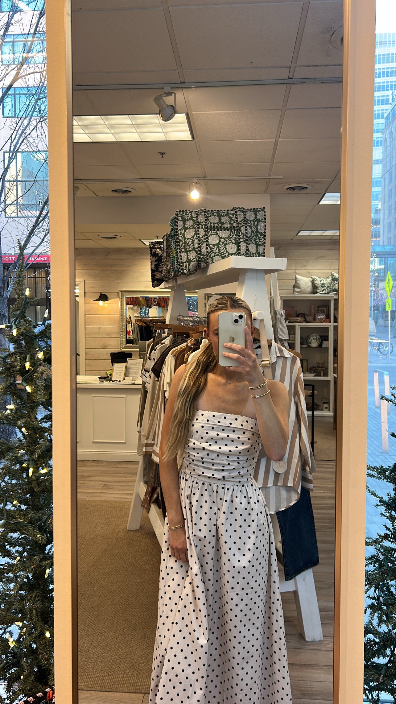 Elevate your evening wardrobe with the Nellie Polka Dot Tube Maxi Dress—a timeless piece that effortlessly blends sophistication with playful style. The classic ivory and black polka dot pattern creates visual interest, while the strapless tube silhouette offers a sleek, modern look that flatters every figure. Intricate smocking detailing on the back adds texture and dimension, ensuring you'll turn heads from every angle.