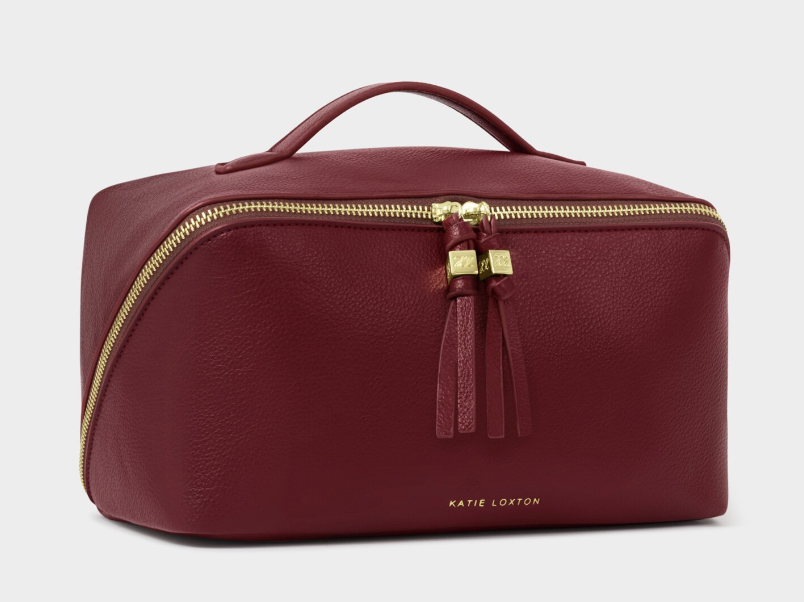 Keep your beauty essentials organised on the go with our Soho Large Makeup and Wash Bag in Cherry. Features a handy central divider, elasticated slip pockets, and finished with a golden charm tassel zip for a touch of luxe.