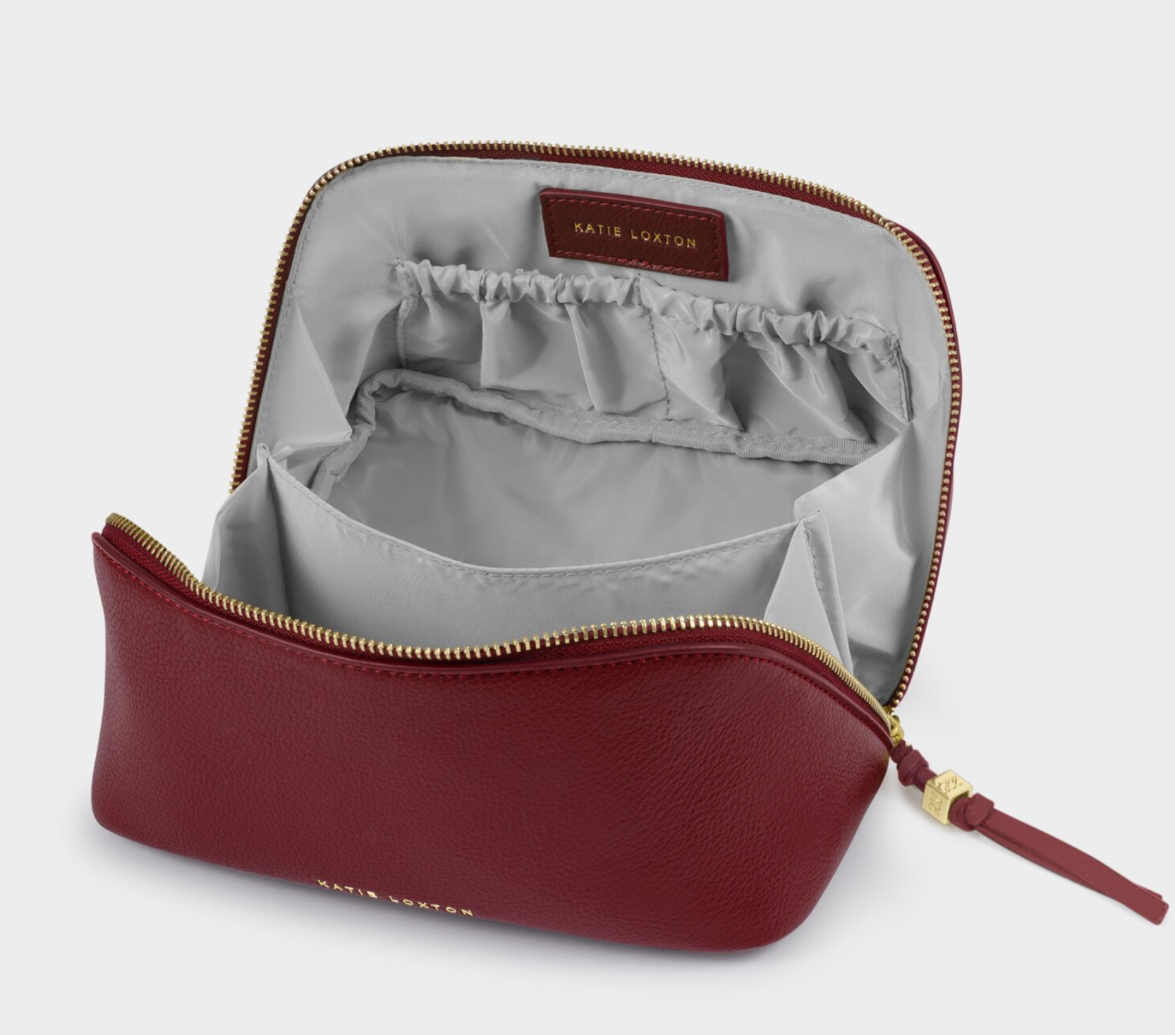 Keep your beauty essentials organised on the go with our Soho Medium Makeup and Wash Bag in Cherry. Features a handy central divider, elasticated slip pockets, and finished with a golden charm tassel zip for a touch of luxe.