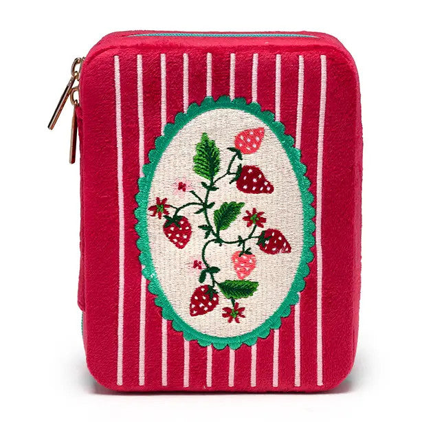 nsure your jewelry stays protected and stylish on the go with Living Royal's Strawberry Velvet Jewelry Zip Case. This ultimate travel companion is perfectly designed for organizing all types of jewelry, including rings, earrings, necklaces, and bracelets, using multiple hidden slots and compartments to keep your valuables secure. Crafted from luxurious, super soft velvet, each case also includes a built-in mirror for added convenience.