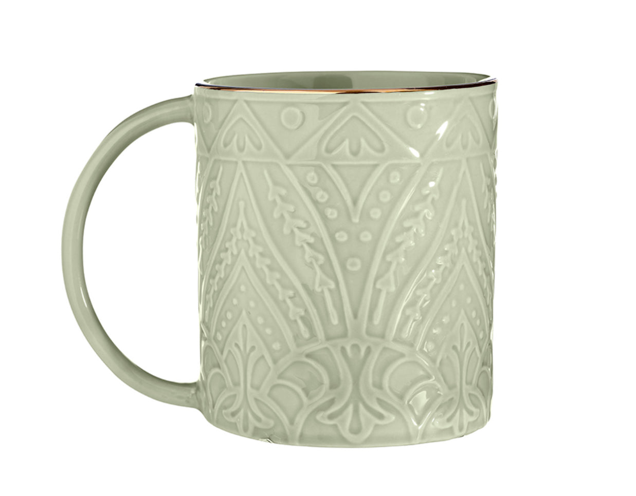 Crafted from durable ceramic and finished in a soft, nature-inspired glaze, this mug features a hand-stamped pattern of pine needles and forest foliage that wraps elegantly around its surface. Hand wash only to preserve the embossed details. Adds a touch of rustic elegance to your drinkware collection