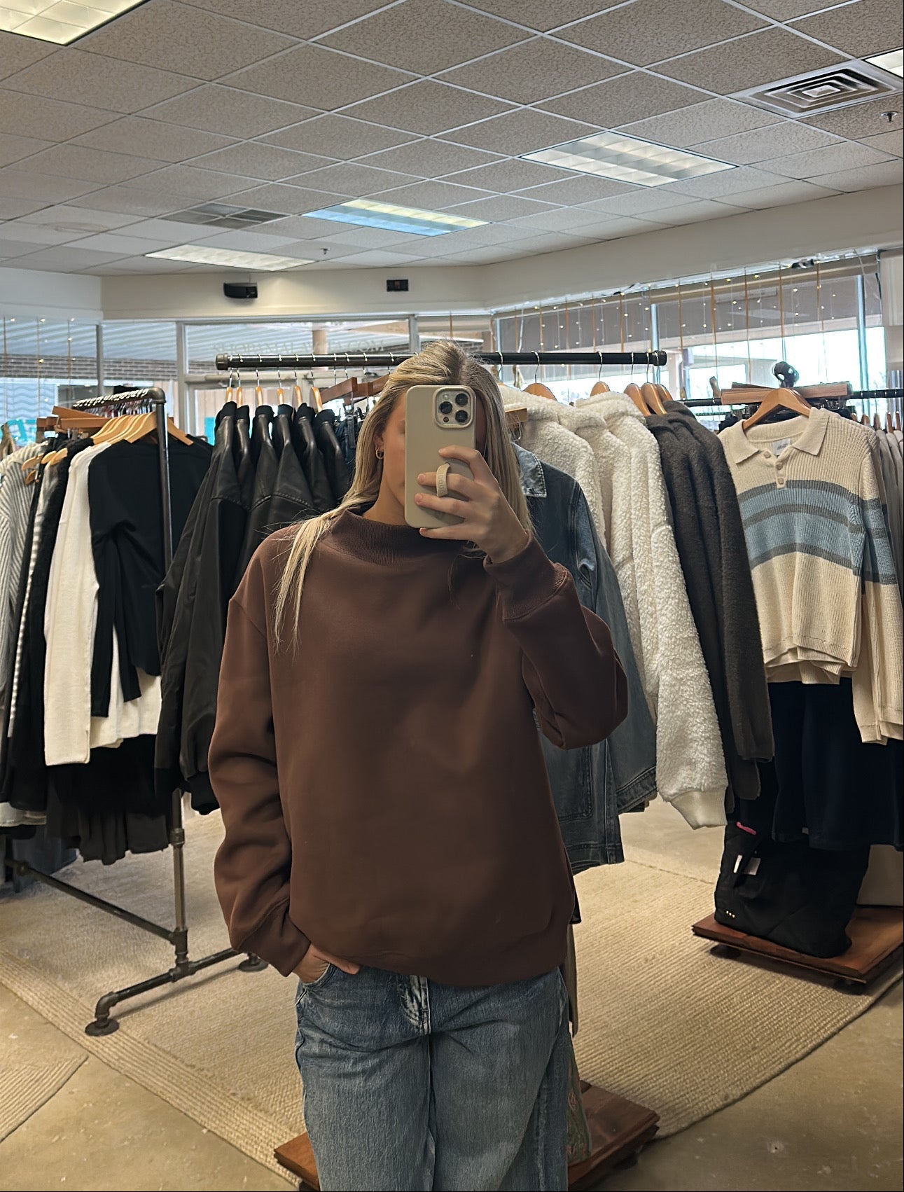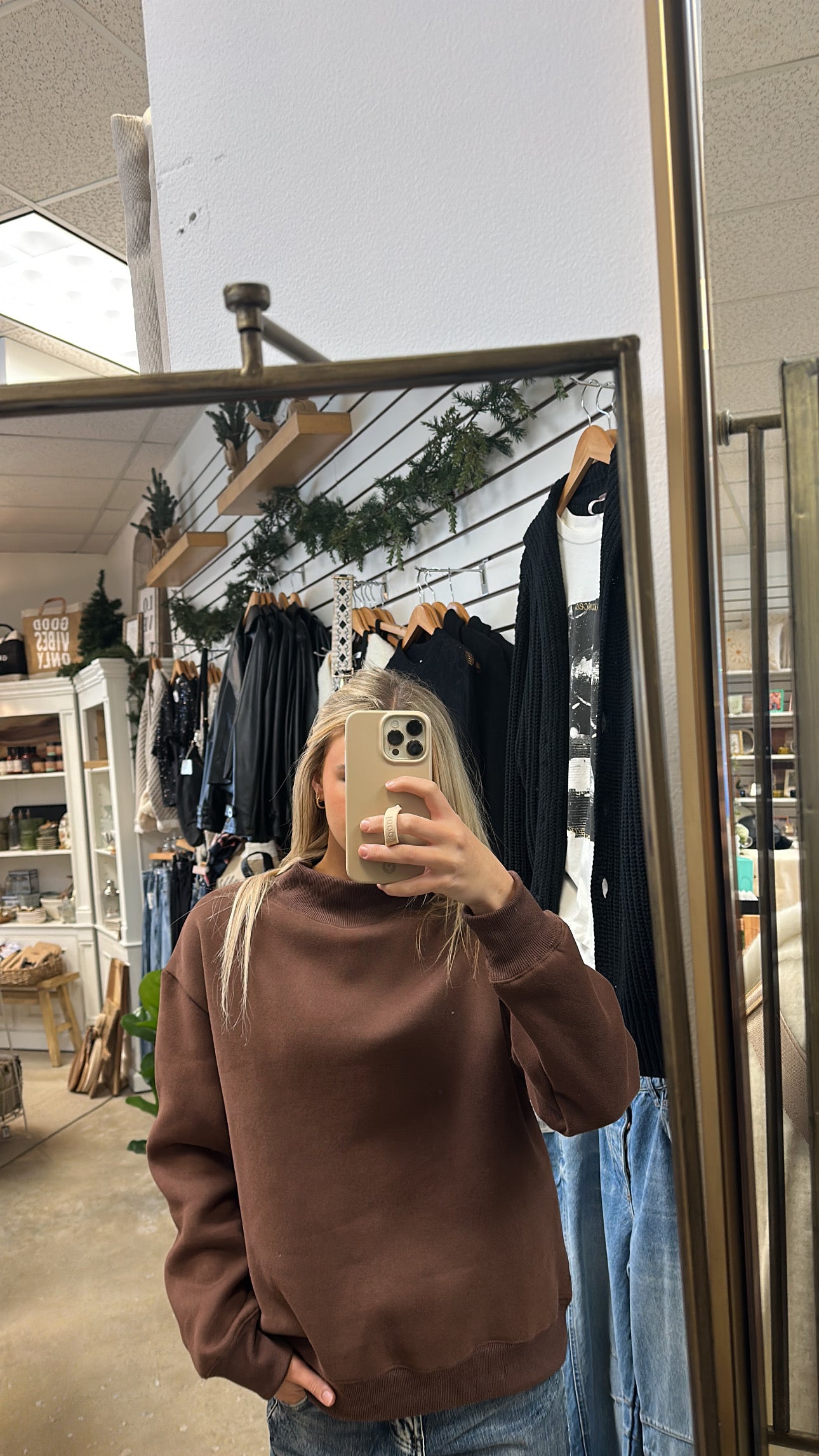 Elevate your everyday wardrobe with the Mia Mock Neck Sweatshirt in rich chocolate. This trendy essential combines comfort with contemporary style, featuring a sleek mock neck design that's been spotted across social media. Perfect for layering or wearing solo, this versatile piece transitions seamlessly from casual outings to cozy nights in. The timeless chocolate hue pairs effortlessly with any outfit, making it a must-have staple for anyone seeking effortless, on-trend style.