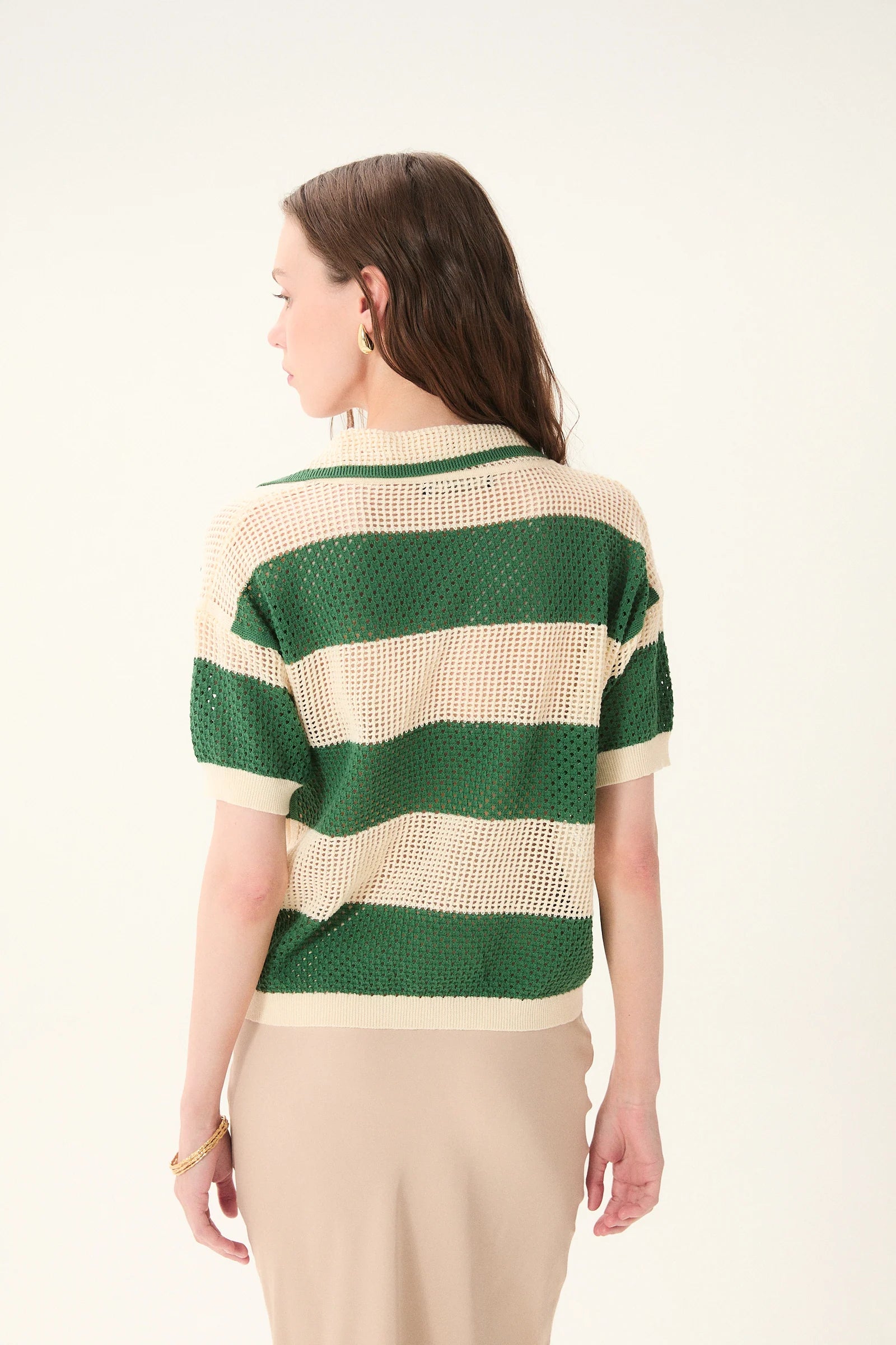 Elevate your spring break wardrobe with this stunning Chicos Knit Polo Top from Dèluc, featuring a sophisticated crochet-look design in timeless ecru and green. The refined knit construction offers breathable comfort perfect for warm-weather getaways, while the polo silhouette delivers polished versatility for both casual resort days and evening outings. Whether layered over a sundress or worn solo, this piece transitions effortlessly from beach to dinner, making it an essential vacation staple that combines style with practicality.