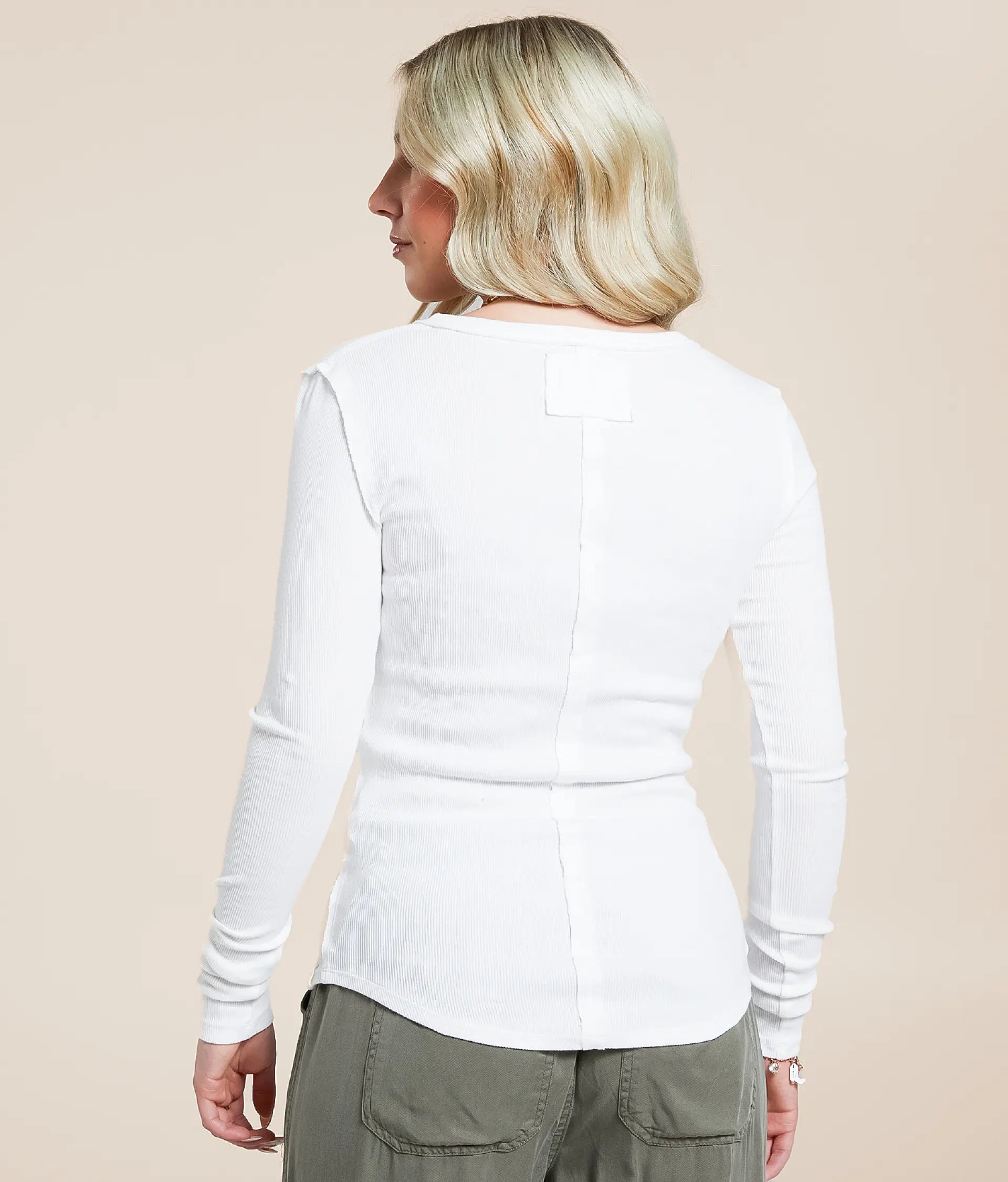 A classic henley with a modern twist. Raw edge details and a fitted silhouette level up your look like never before.