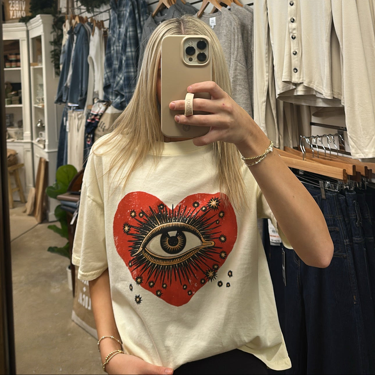 Elevate your casual wardrobe with this charming cropped tee in soft butter yellow. Crafted from comfortable cotton, it features a playful heart-eye graphic that adds personality to any outfit. Perfect for layering or wearing solo, this piece brings warmth and whimsy to your everyday style.