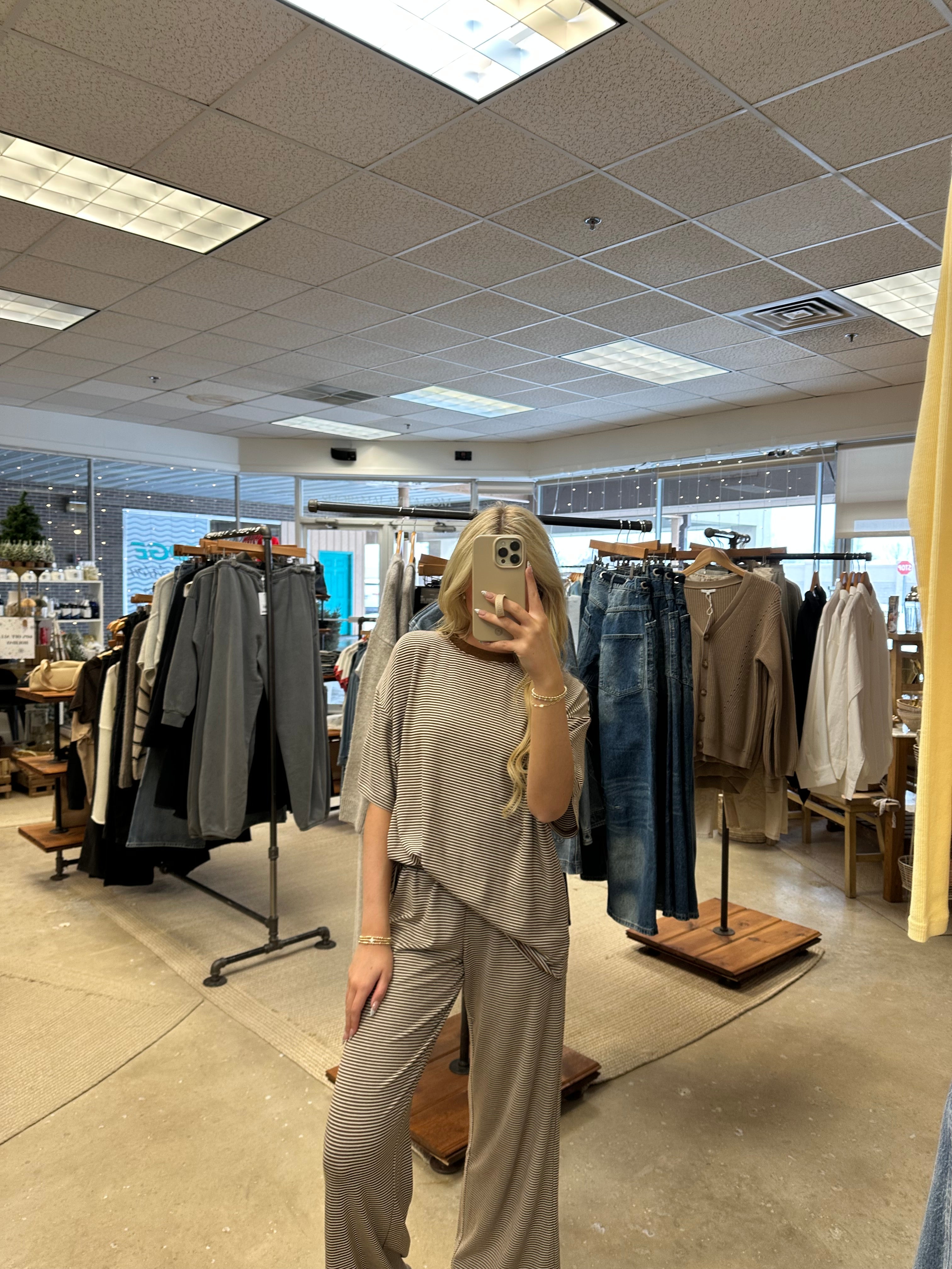 Slip into effortless comfort with the Dannie Stripe Long Pants in Brown. Designed for relaxed lounging, these versatile pants feature subtle striping that adds visual interest without compromising the laid-back vibe. Perfect for pairing with the Stevie Oversized T Shirt, they create an instantly coordinated, cozy look that transitions seamlessly from home to casual outings. Soft, breathable fabric keeps you comfortable all day long.
