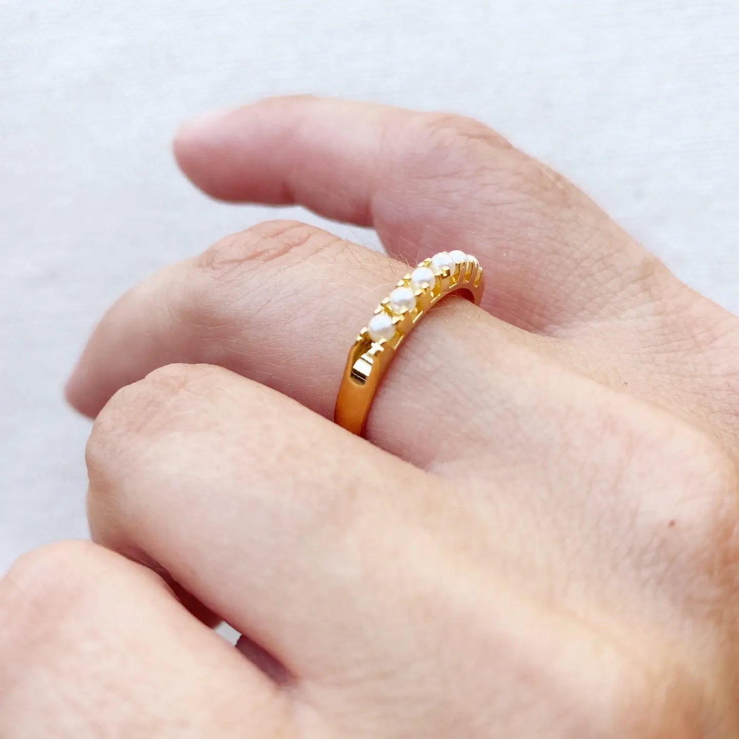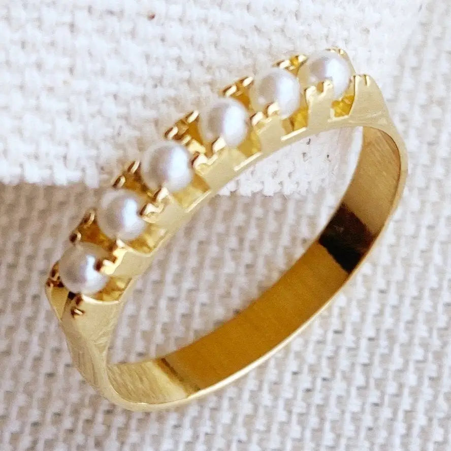 Elevate your everyday elegance with this stunning 18k gold filled ring, featuring lustrous synthetic pearls that capture light beautifully. The delicate pearl accents add timeless sophistication to any look, while the durable gold-filled construction ensures lasting wear and lasting value. Available in sizes 7.5 and 8.5, this versatile piece transitions seamlessly from casual to formal occasions. Perfect as a gift or a personal treasure, it combines classic beauty with modern craftsmanship for a ring you'll reach for again and again.