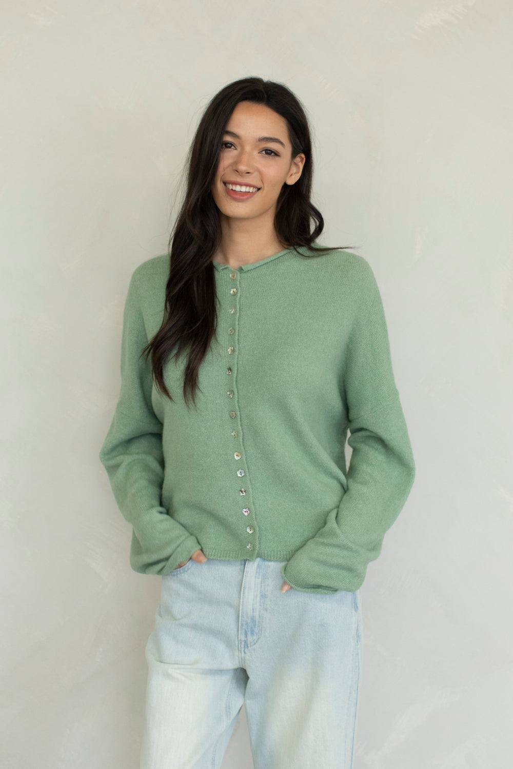 Super soft, lightweight cardigan with rolled knit edges and different-shaped buttons.