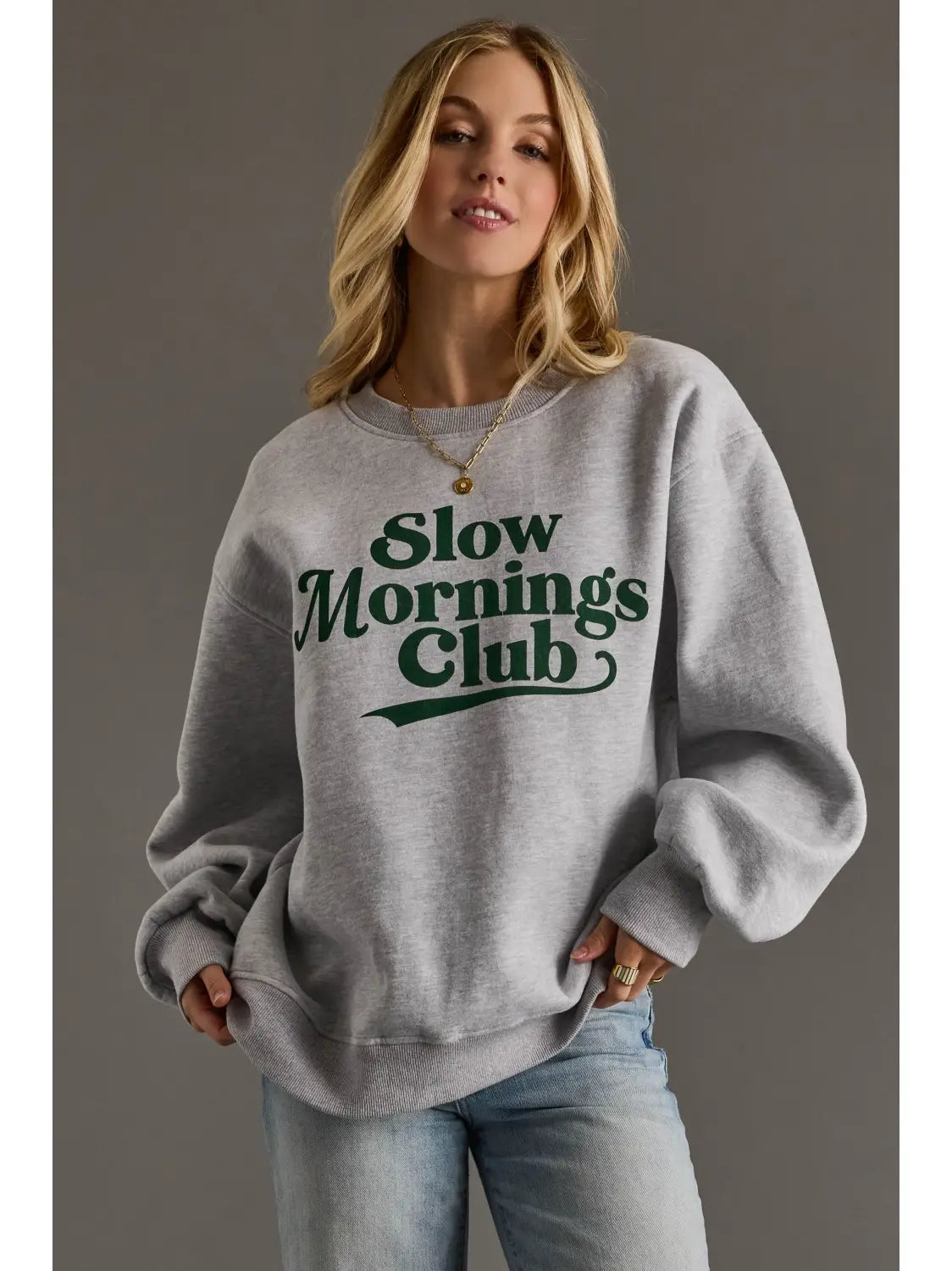 Embrace a slower pace with our Gray Slow Mornings Club Sweatshirt, featuring bold dark green text that celebrates the beauty of unhurried mornings. Crafted from soft, comfortable fabric, this sweatshirt is perfect for cozy coffee moments, leisurely breakfasts, or simply taking time for yourself. The relaxed fit and quality construction make it an everyday essential that pairs effortlessly with your favorite jeans or loungewear. Join the movement toward mindful mornings and wear your commitment to self-care with style.