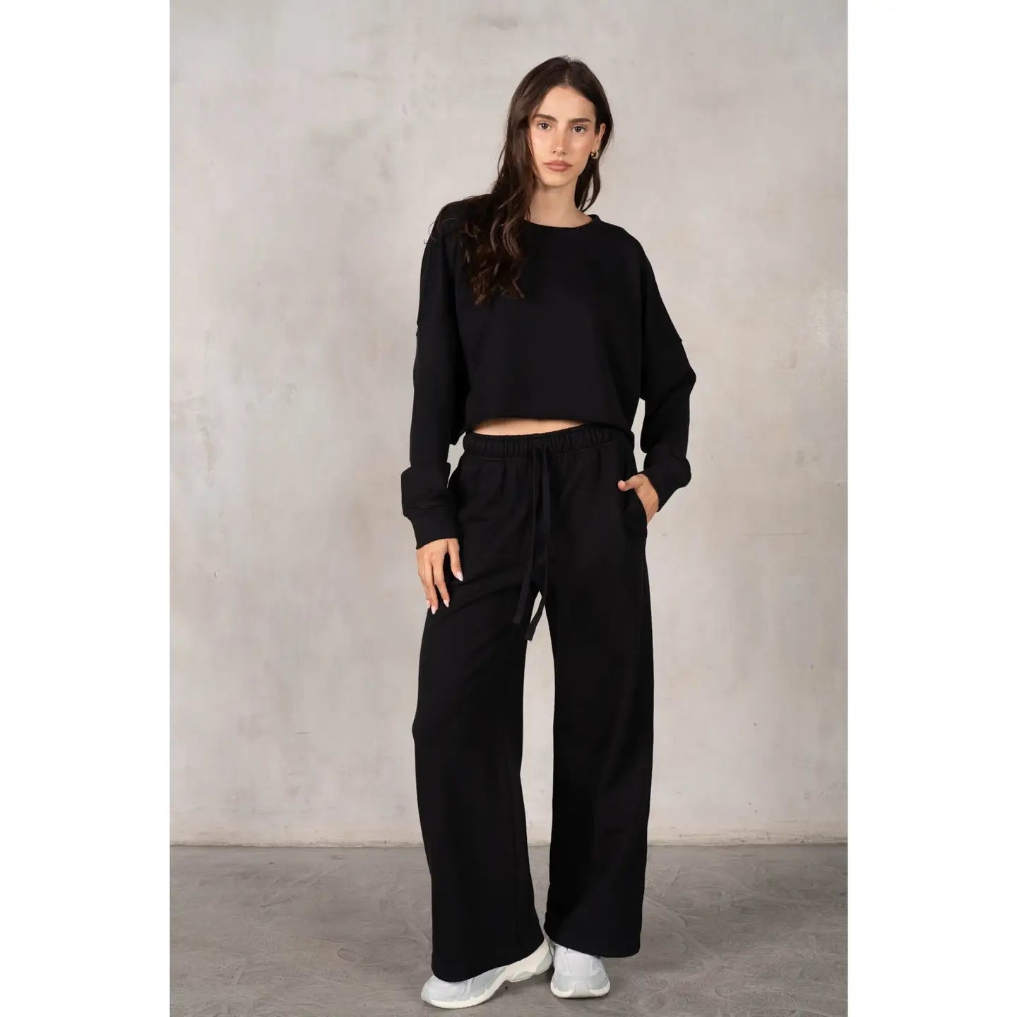 Effortless comfort meets contemporary style with this cropped long-sleeve sweatshirt. Crafted from soft cotton loop terry fabric, it delivers a luxurious feel against your skin while maintaining a relaxed fit. The cropped silhouette pairs perfectly with high-waisted bottoms for a modern, flattering look. Ideal for layering or wearing solo, this versatile black piece transitions seamlessly from casual weekends to laid-back evenings. A wardrobe essential that combines quality construction with timeless appeal.