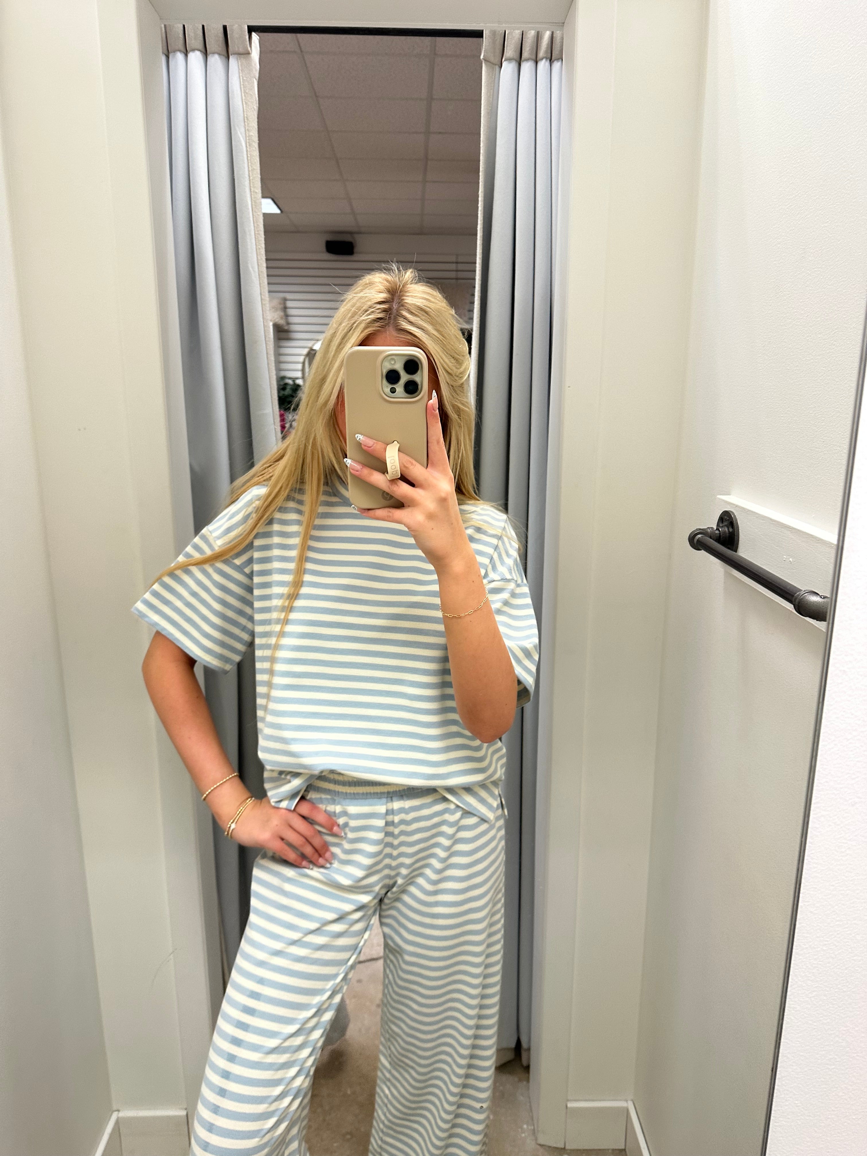 Logan Striped Short Sleeve T Shirt - Light Blue Elevate your everyday wardrobe with this versatile striped tee that effortlessly transitions from casual to polished. The crisp light blue and white stripes create a timeless look that pairs beautifully with our Carter Striped Straight Pants for a coordinated ensemble. Crafted for comfort and style, this short sleeve shirt works as a standalone piece or layered under jackets and cardigans. Perfect for building a capsule wardrobe that works harder for you—mix and match with your existing pieces to create endless outfit combinations that feel fresh and intentional.