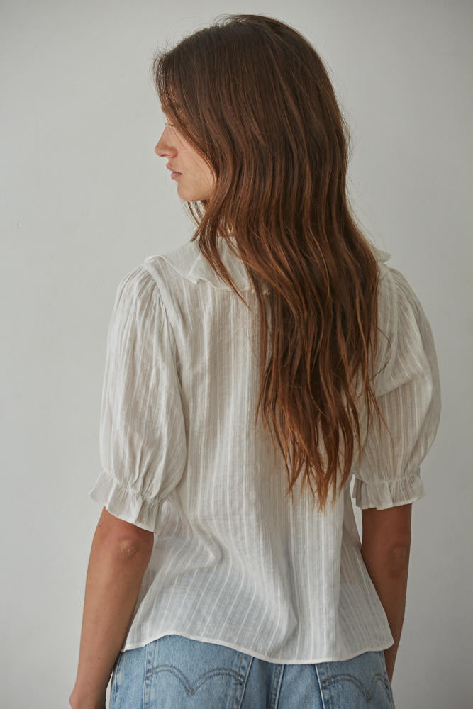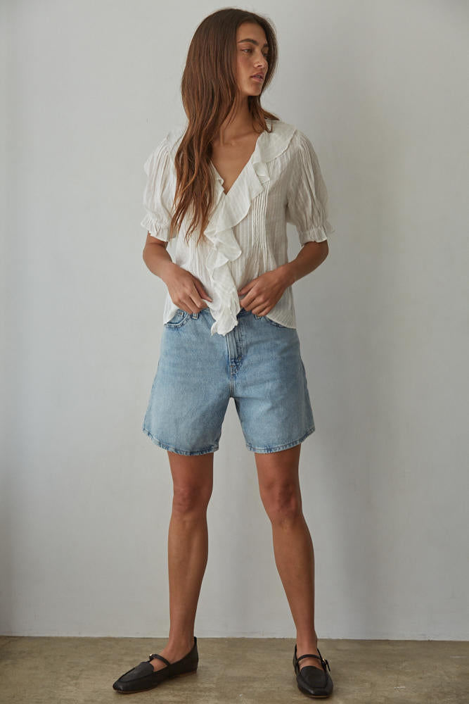 Elevate your everyday wardrobe with the Tempe Ruffle Top, a versatile woven cotton essential that effortlessly transitions from casual to polished. The flattering V-neck silhouette and short sleeves offer breathable comfort, while delicate ruffle detailing adds a touch of feminine charm and visual interest. Perfect for layering or wearing solo, this off-white buttondown pairs seamlessly with jeans, skirts, or trousers for endless styling possibilities. Crafted from quality woven cotton, it's a timeless piece you'll reach for season after season.